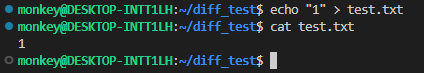 간단한 예시를 통해서 git diff 명령어에 대해서 알아보도록 하겠습니다. 먼저 Git 저장소인 diff_test 디렉터리를 하나 만들었습니다. 그런 뒤 test.txt에 1을 썼습니다.