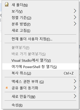 거기에서 "여기에 PowerShell 창 열기"를 선택하면 창이 하나 뜬다.