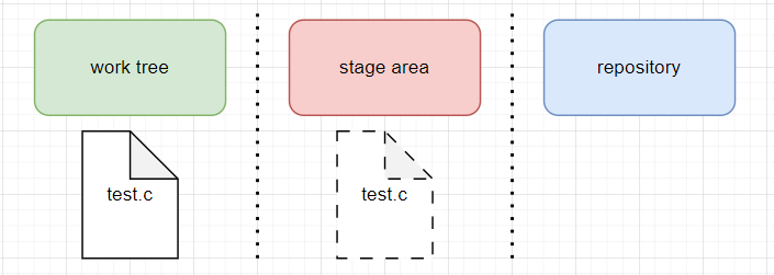 test.c가 stage area에 있지만, work tree에서 추가로 test.c를 수정할 수 있습니다. 수정한 내용을 stage area에 반영하려면 git add command를 이용합니다. stage area에 추가되었다는 것은 repository로 갈 자격이 주어졌다는 것입니다. 단지 work tree, 즉 작업 공간에서 작업하는 것을 임시 공간에 저장한다고 생각하시면 됩니다.